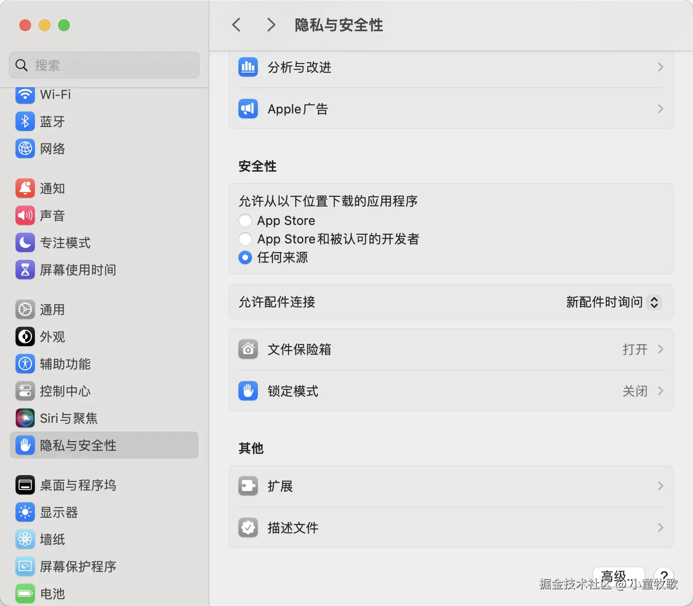 接着打开【系统设置】,选择【隐私与安全性】,滑动到【安全性】,选择【任何来源】。