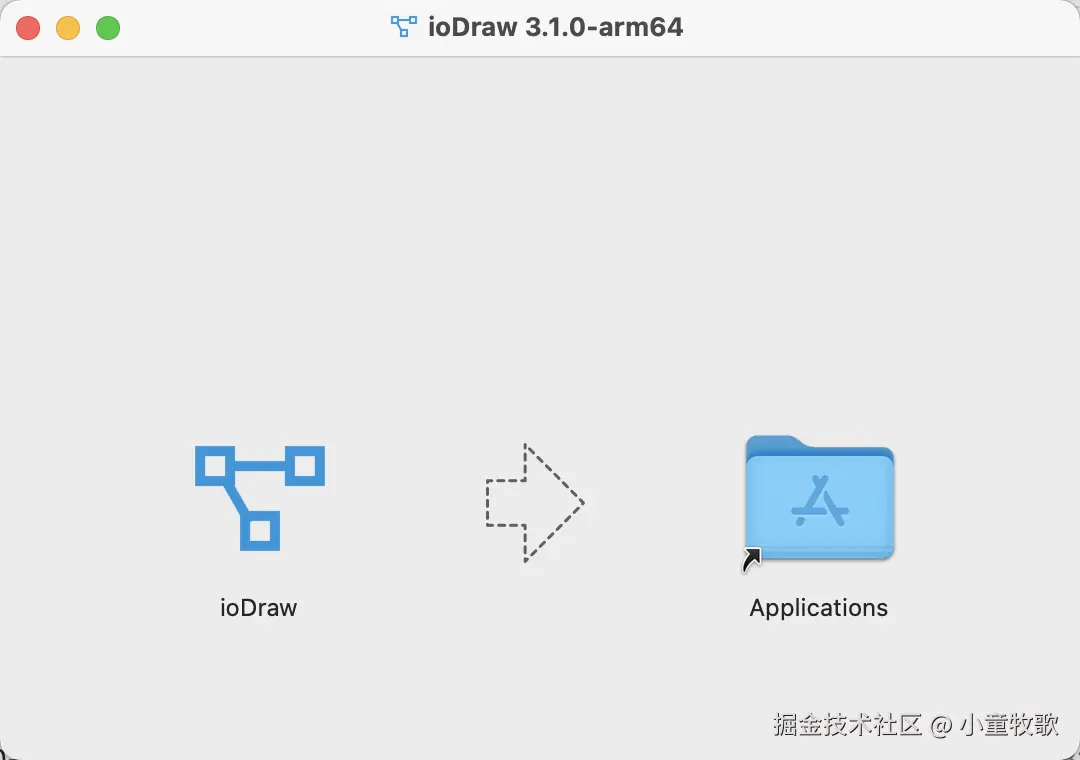 下载后,打开.dmg文件,将左边的ioDraw图标拖到右边的Applications文件夹中。