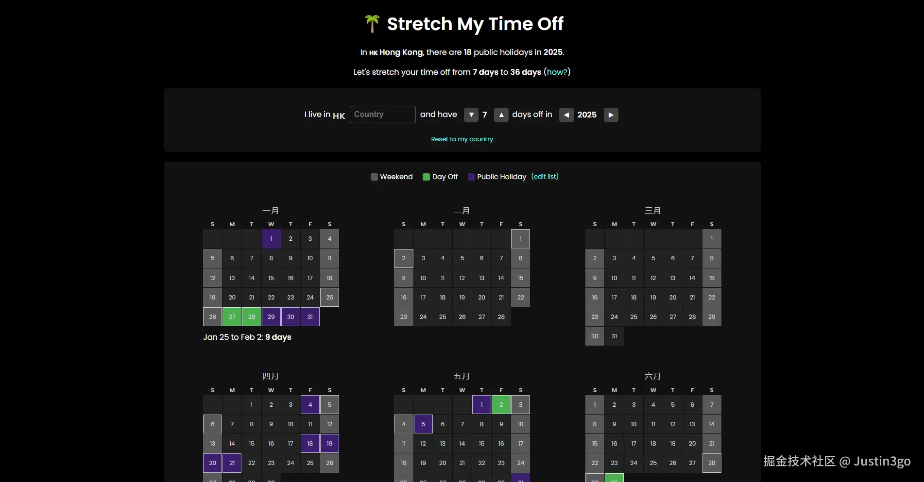 该工具通过您的 IP 检测您的国家,使用来自维基百科的默认政府规定的休假天数;该算法优先填补最短的空缺。它优化了全年假期的分布,以创造最多的连续假期。对于计算,它计算所有为期 3 天或更长的假期,包括由于公共假期而幸运地出现的 3 天周末。这有点乐观,但体现了最大化休假的精神。