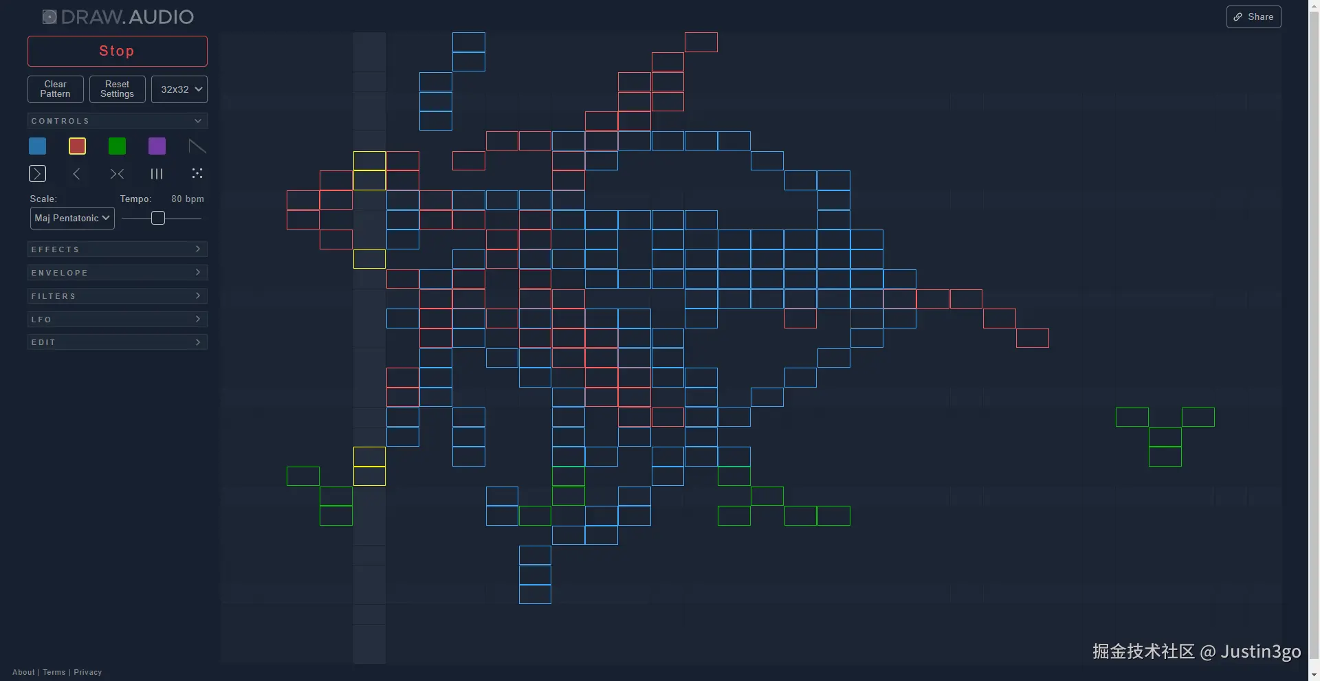 通过绘制不同位置、颜色的方块,使用不同的播放顺序等组合来创造属于你自己独有的音乐,很有意思!