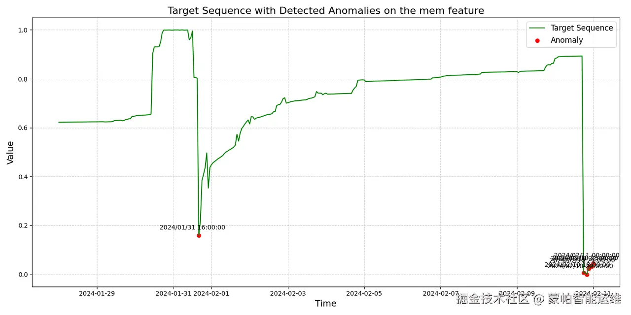 图 3. DeepAnT 在 Memory 时序数据中的异常检测结果