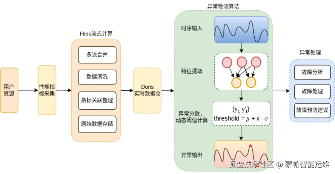 如图 4 所示,大数据在用户端采集各项性能指标,通过 Flink 框架进行数据流式处理存入 Doris 实时数据库,将指定指标时序数据传入算法接口,时序数据通过神经网络进行特征提取,并训练时序预测模型用于下一步的异常分数和动态异常阈值计算,然后即可得到异常输出,进入下一步的一场处理阶段,从而完成一个完整的异常检测流程。