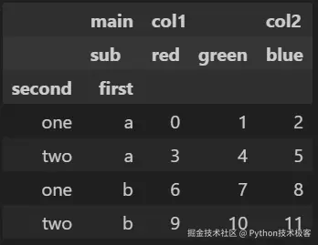 我们可以通过 index 属性获取到 DataFrame 对象的行索引、通过 columns 属性获取到 DataFrame 对象的列索引, 如下所示,输出的是一个以 MultiIndex 对象的索引