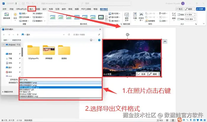 第二步: 之后选中图片,点击右键选择 【另存为图片】 选项。在弹出的保存对话框中,选择 【jpg】 作为保存的图片格式,并设置一个合适的文件名和保存路径。