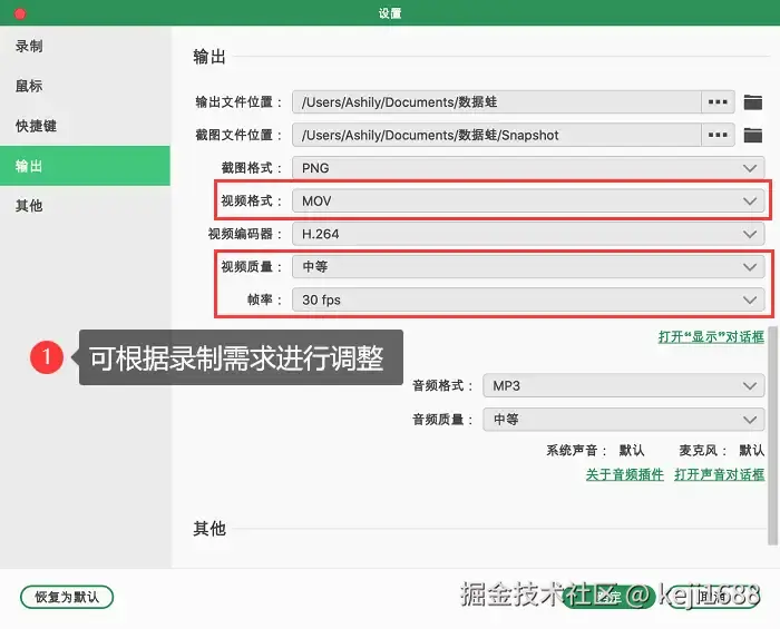 步骤2:在录制页面里,首先可以自定义录制区域。苹果录屏怎么把声音录制进去?我们可以对声音进行调整,系统声音对应电脑内部声音,麦克风对应电脑外部声音,根据自己的需求进行开启。想要录制出不同质量或格式的视频,我们可以进入 【设置】 中进行自由调整。