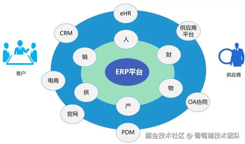 以下是某装备制造企业在数字化转型方面的建设示意图。该企业在数字化转型的早期建立了一套以 ERP 平台底座为基础,以人、财、物、产、供、销的企业资源六要素为核心的“业财一体化”管控体系。这一举措助力该企业打通了供应商和客户之间的上下游供应链,确保了供应链和生产的协同运作。