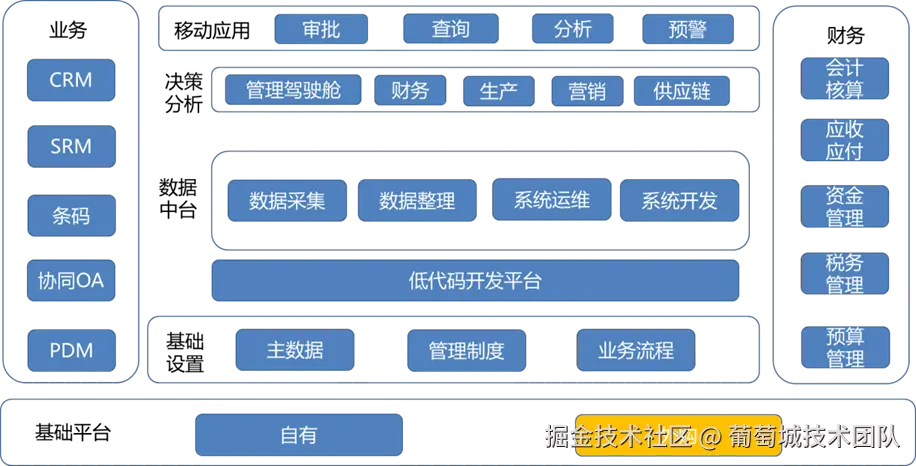 以下是该企业引入低代码平台后的系统架构图。通过低代码工具开发的决策分析和移动应用平台,数字化展示了企业的主数据、管理制度和业务流程,并与企业现有的业务系统和财务系统相连接,打通数据孤岛,实现生产、营销、管理、供应、审批、财务、分析、查询和预警的一体化综合系统。同时,该系统可与外购系统实现无缝集成,有助于企业进一步增强对人、财、物、产、供、销的管理能力,推动企业数字化转型的可持续发展。