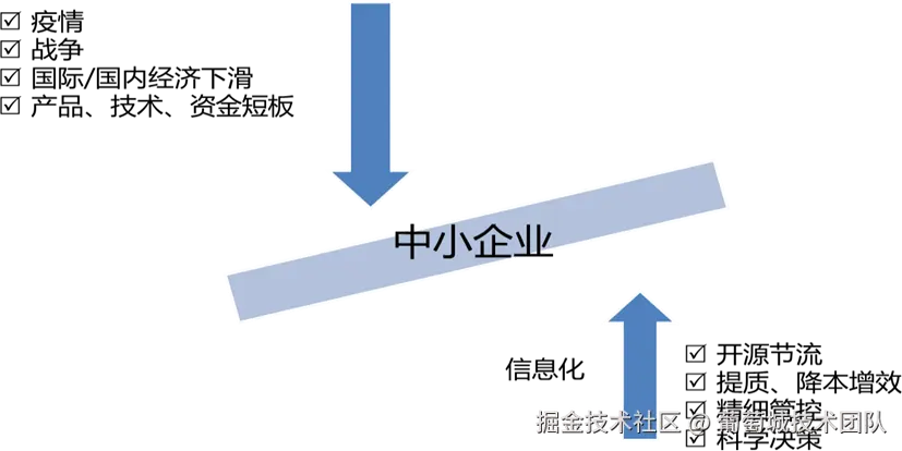 自 2019 年疫情以来,世界经济遭受重创,呈现持续下滑态势,国内经济同样受到较大影响,大部分企业,订单大幅缩减,经营遭遇困境。这其中,中小企业受到的冲击最大,再加上“资金、技术”等生产要素处于劣势,生产、经营遭受前所未有的困难,面临生存的极大考验。如何通过信息化手段助力企业开源节流,摆脱困局,实现数字化转型,成为首要解决的问题。