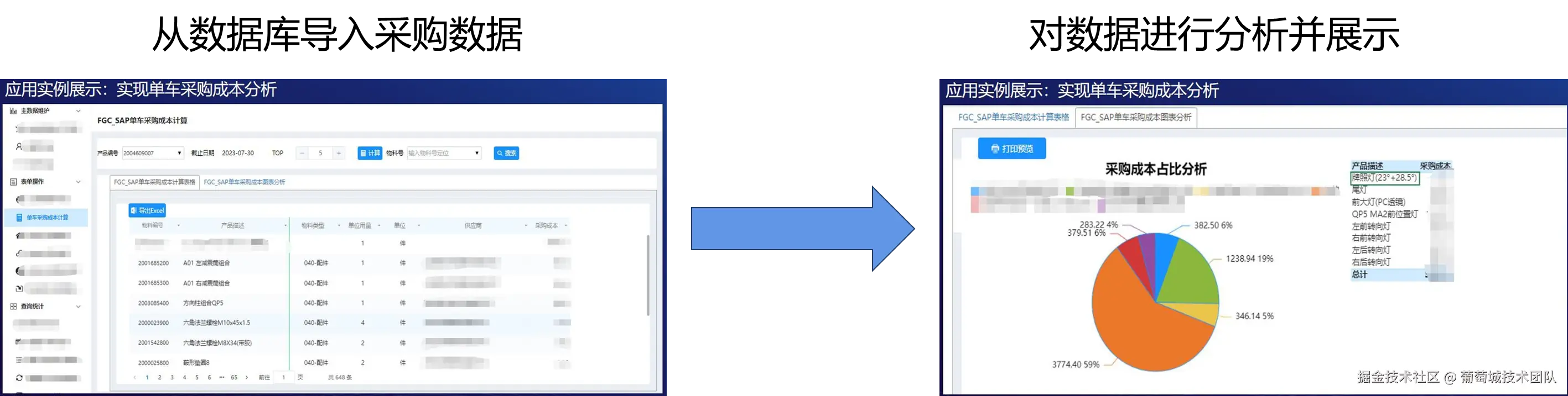 下面是该企业系统功能的详细展示:在成本分析模块中,系统从数据库中导入所有的采购数据并展示。工作人员可以根据自身的业务需求查询并核算特定单品的成本,随后将成本数据进行占比分析展示,以确定该成本的盈亏情况。