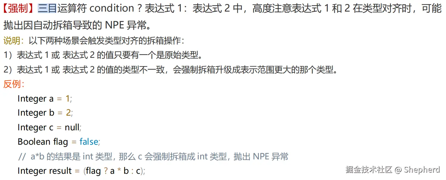 使用if-else替代:在遇到需要处理可能为 null 的包装类型时,可以用 if-else 语句替代三目运算符。