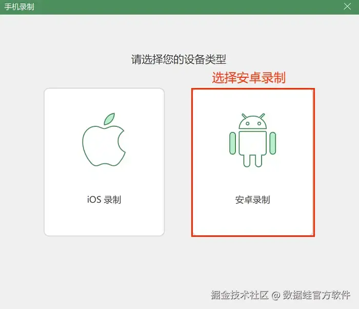 步骤2: 根据手机类型选择录制方式,oppo手机选择安卓录制。然后选择合适的连接方式,本文以无线连接为例。