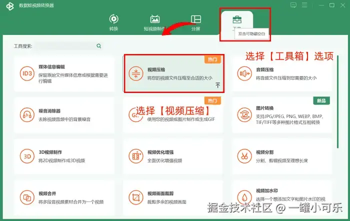 步骤1:运行数据 蛙视频转换器后,选择 【工具箱】 选项,在其选项下选择 【视频压缩】 功能。