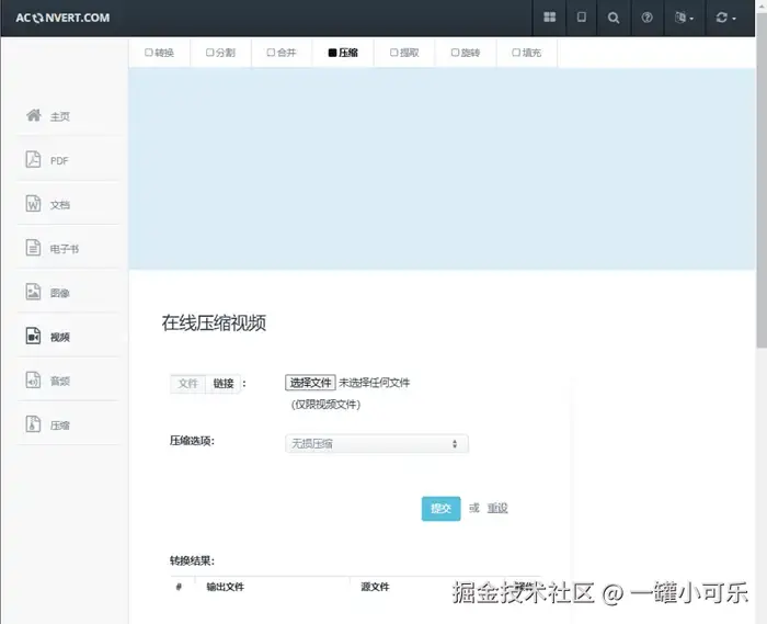 Aconvert也是在线视频压缩网站,但相对于Youcompress来说,其压缩视频的功能稍微多一点。该网站可以选择压缩选项,即无损压缩、降低视频比特率以及更改CRF的选项。不过,这个网站也只能够压缩体积较小的视频,较大的体积视频文件压缩效果不太理想,速度也较慢,并且还有较多的广告弹窗。