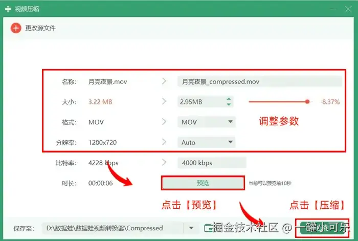 步骤3:跳转至视频压缩界面后,在界面提供的压缩选项中,根据需求调整参数并点击【预览】,查看压缩效果;调整完成后,点击 【压缩】 按钮。