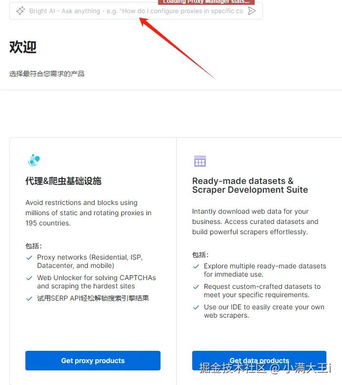 众多初次尝试使用代理的新用户,在面对代理设置及相关技术细节时,往往感到陌生与困惑,一时之间难以入手。为此,亮数据开发团队特别在平台中集成了ChatGPT助手,在登录界面上方可以输入框,就可以开始使用AI提问了: