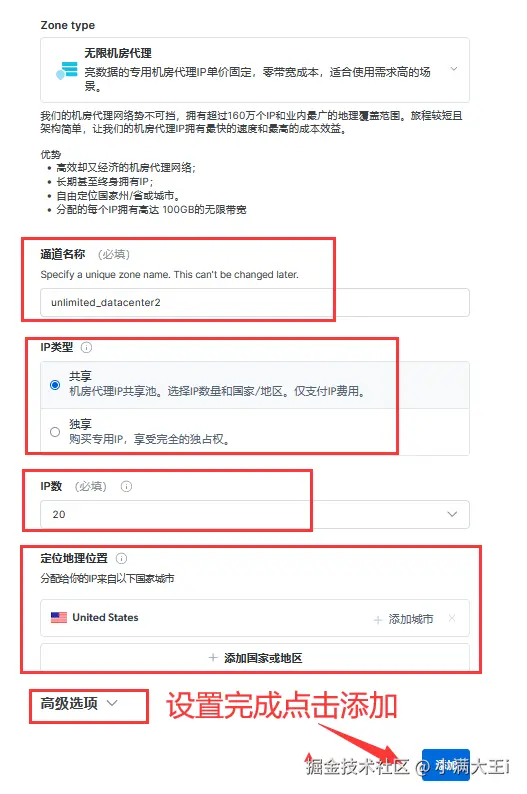 7、配置通道,可以设置IP类型(共享/独享)、IP数、IP来源国家等等:
