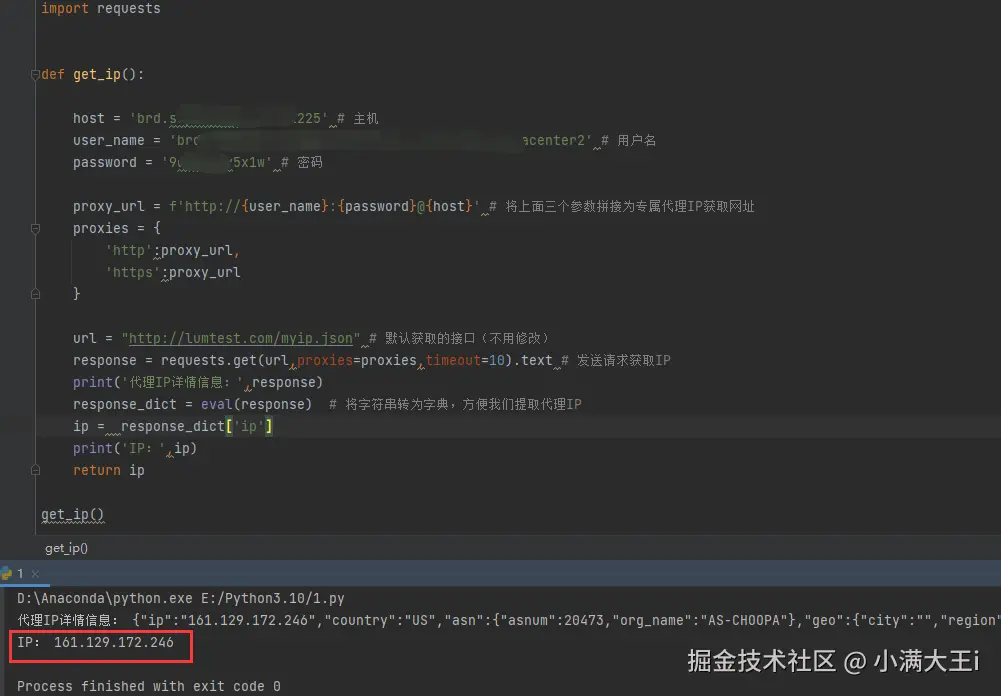 9、下面代码只需要修改刚才获取到的主机、用户名和密码,即可返回代理IP:
