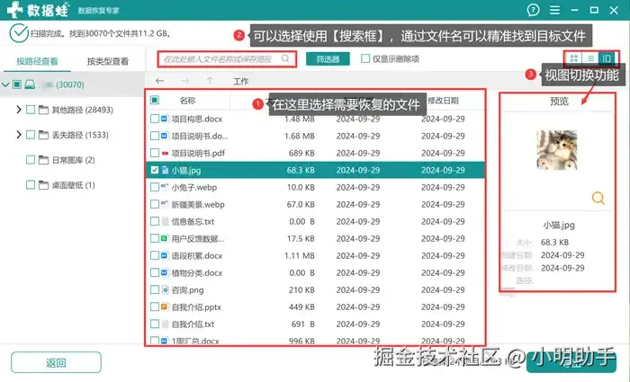 步骤2: 扫描出来的文件全部显示出来的时候,用户可以在指定位置里选择自己需要恢复的文件,还可以借助上方的【筛选器】、【搜索框】等工具进行搜索。