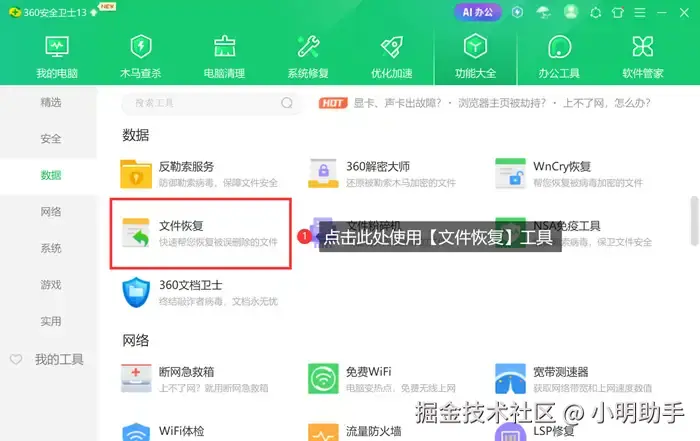 打开360安全卫士首页, 点击【功能大全】后点击左侧的【数据】,然后就能看见【文件恢复】工具了。点击进去按指示选择需要扫描的U盘然后选择需要恢复的文件即可。