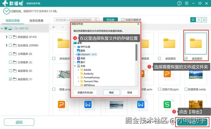 步骤3: 选中自己需要恢复的文件后,点击【导出】,然后选择自己文件需要存放的位置,完成U盘文件恢复。