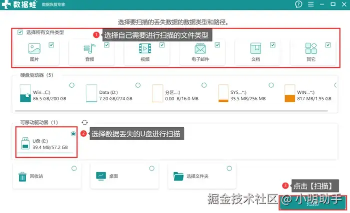 步骤1: 在电脑里打开数据 蛙恢复专家,在软件首页按自己的实际需求选择好需要恢复的文件类型和扫描位置(U盘等外部存储设备需要提前连接好电脑),然后点击右下角的【扫描】。
