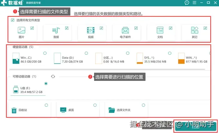 第1步: 打开软件后进入首页,在上方选择需要扫描的文件类型,然后在中下方选择需要扫描的位置,选完再点“扫描”。