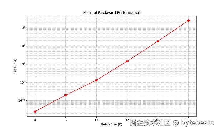 图 2: Rust BLAS matmul 反向性能与批量大小 B(从 4 到 128)的对数图. 批量大小为 4 意味着输入和输出张量大小为 12饸, 批量大小为 128 意味着输入/输出张量大小为 402髥餐.