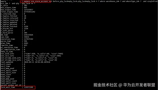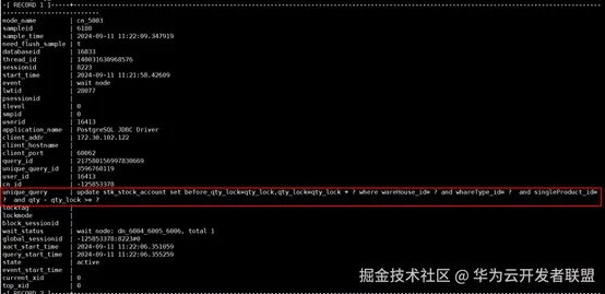 利用上一步查询出来的query_id,并结合gs_asp视图,可以通过如下语句获取该SQL语句的详情。查询结果如图22所示,可以看到,阻塞该语句的也是同一张表的update语句,这表明是由于并发更新同一行数据所导致的锁冲突。