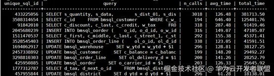 select unique_sql_id,substr(query,1,50) as query ,n_calls,round(total_elapse_time/n_calls/1000,2) avg_time,round(total_elapse_time/1000,2) as total_time from dbe_perf.summary_statement t where n_calls>10 and avg_time>3 and user_name='root' order by total_time desc;