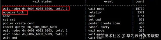 如图19所示,该时间段数据库占比最高的两个等待事件,一个是等待dn_6004_6005_6006分片返回执行结果,这需要进一步排查该分片上性能瓶颈的原因;另外一个等待事件是acquire lock(relation),表示存在大量的表级锁等待。