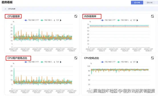 登录管控平台后,进入监控巡检菜单,选择监控大盘,即可查看对应实例的CPU/内存使用率,如图2所示: