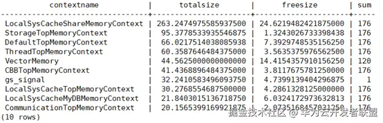 select contextname, sum(totalsize)/1024/1024 totalsize, sum(freesize)/1024/1024 freesize, count(*) sum from gs_thread_memory_context group by contextname order by sum desc limit 10;