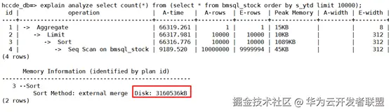 2)在GaussDB中,SQL的hash join或者sort算子存在数据落盘操作,work_mem参数控制可下盘算子可用的物理内存空间。如果work_mem所限定的物理内存不够,算子运算的数据将被写入临时表空间,会带来5-10倍的性能下降。为了优化性能,可以查看SQL的执行计划,如果算子存在落盘的情况(如图12所示),可适当调整work_mem参数值。