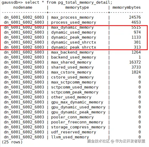 如果需要排查由非业务SQL语句导致的异常的内存消耗问题,比如内存堆积、内存泄露等,GaussDB提供了丰富的内存相关的监控视图,可以通过下面的视图(如图13所示),查看数据库节点的内存消耗情况。