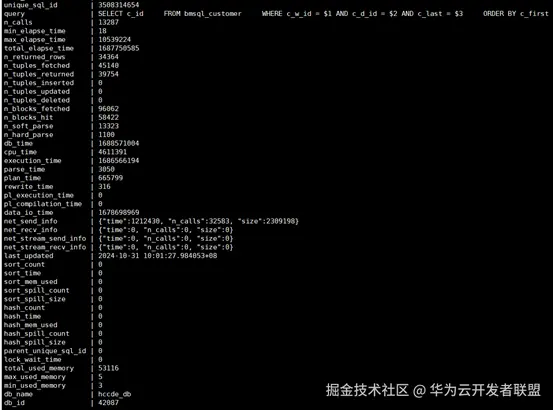 如图7所示,该视图记录了SQL语句在数据库的详细执行情况,比如,总执行次数(n_calls)和总耗时(total_elapse_time),便于获取该SQL的总耗时以及平均耗时。