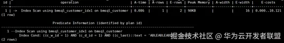 explain analyze SELECT c_id FROM bmsql_customer WHERE c_w_id = 1 AND c_d_id = 1 AND c_last = 'ABLEABLEABLE' ORDER BY c_first;
