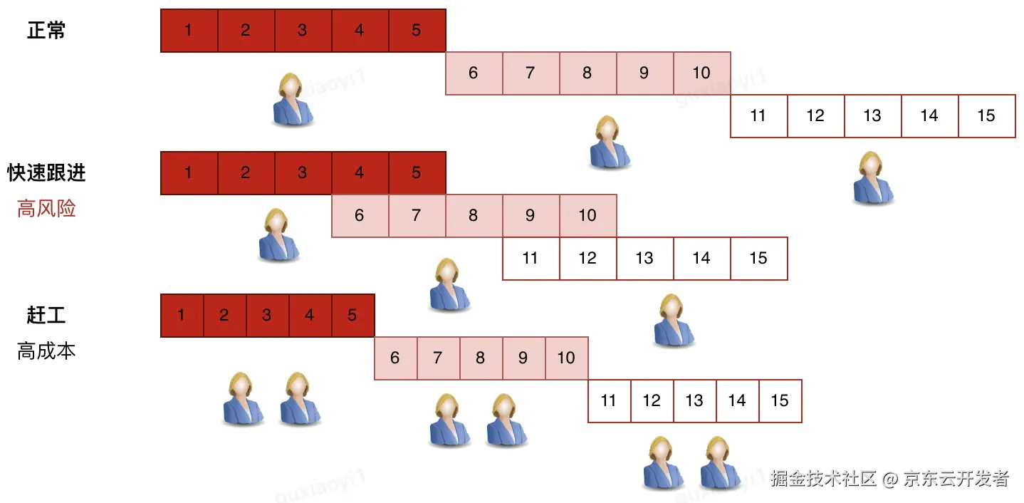 •第一,快速跟进,并行施工,以缩短关键路径的长度。例如要求算法同学同时进行开发,如果有前置依赖的可以先开发算法逻辑,待前置依赖ready立马进入开发进程。在项目过程中存在着依赖关系,有些是强制性依赖关系,有些是自由依赖关系,这些依赖关系使得项目之间存在着先后次序,在进度落后的情况下我们可以打破这种先后次序,使得某些活动重叠进行。当然,打破这些次序大多数情况下会对项目产品的质量带来风险,但是自由依赖关系则不存在这个问题,因此可以首先调整那些自由依赖关系的活动,然后再考虑强制性依赖关系的活动。