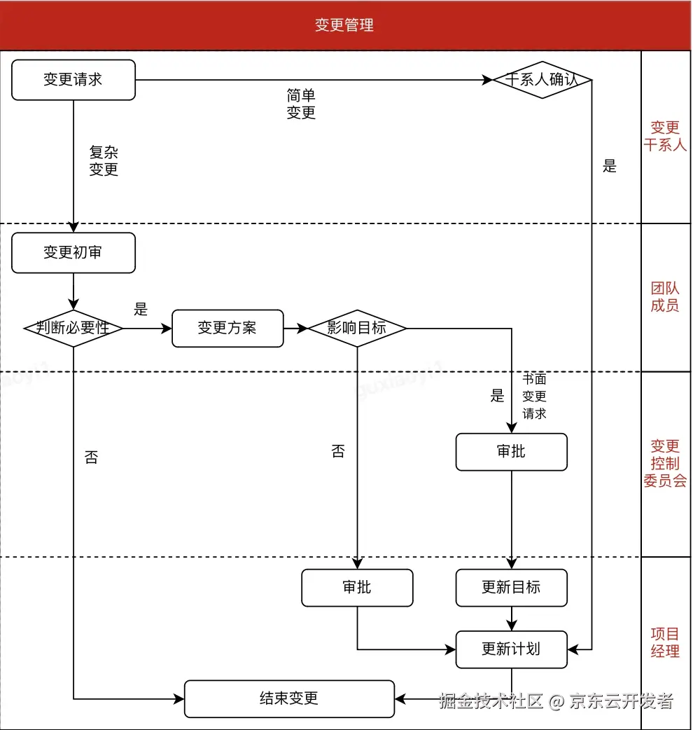 •原则是非必要情况不变更。当项目进行过程中确实出现计划排期外的、紧急需要开发的内容时,在研发上报该变更点之后,应该先跟对应的产品同学确认该更改是否必要进行,将涉及到该处变更的相关方全部拉入一个讨论组,共同商议变更事宜。(按照经验来说,很大一部分的变更都可以不做,或者说使用现有能力来完成。)