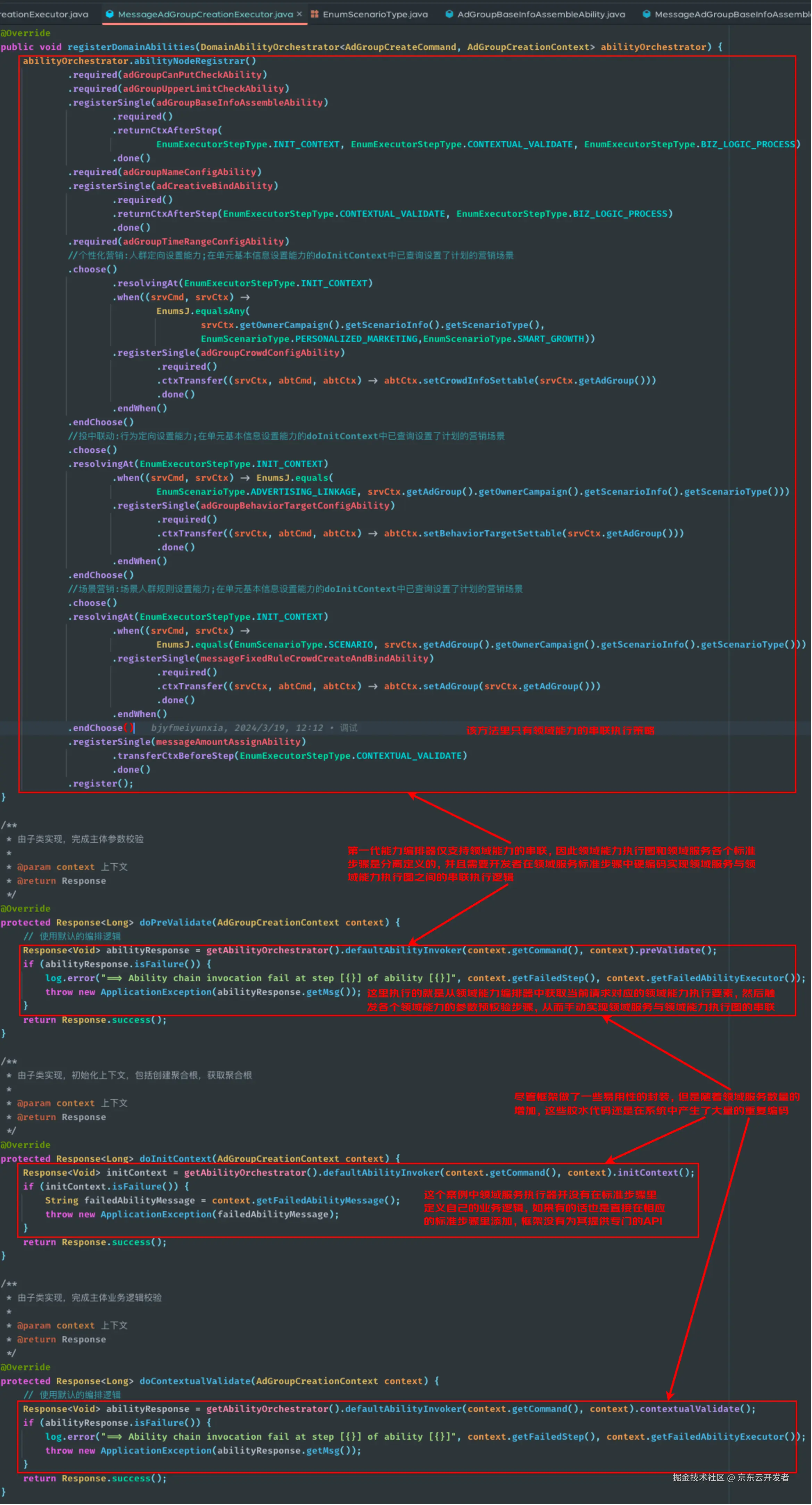 截止到目前,PICASO领域能力编排框架已经经历了两轮功能迭代,前文所述的顺序、条件及循环编排是第一代能力编排框架提供的特性,这一代能力编排框架仅支持领域能力之间编排串联,而领域服务各个标准步骤内的业务逻辑和能力执行图之间的串联依然需要手动硬编码实现。下图给出了一个使用第一代能力编排框架的领域服务案例,这个案例也清晰地呈现了领域能力执行图与领域服务各个标准步骤之间的关系。可以看到领域服务执行器提供了一个标准的领域能力编排入口registerDomainAbilities,该模板方法通过参数提供了一个领域能力编排器(DomainAbilityOrchestrator),开发者可以通过该模板方法完成领域能力执行图的构建。然而当请求到来时,标准业务模版执行引擎并不会直接触发领域能力执行图的调用,它仅会按照标准业务执行流程依次调用领域服务执行器的各个标准步骤,而领域能力执行图的调用则必须由开发者硬编码到领域服务执行器的各个标准步骤中。当然框架已经将领域能力执行图的触发逻辑封装成了相对易用的API(详见下面截图中doPreValidate方法中被标注的代码片段),因此这种设计的实现成本不算太高。但是随着系统中领域服务执行器数量的增长,它也的确在系统中引入了大量重复的胶水代码,并且造成了领域服务中业务逻辑与领域能力值执行图之间的割裂,无法提供彻底的连贯开发体验。