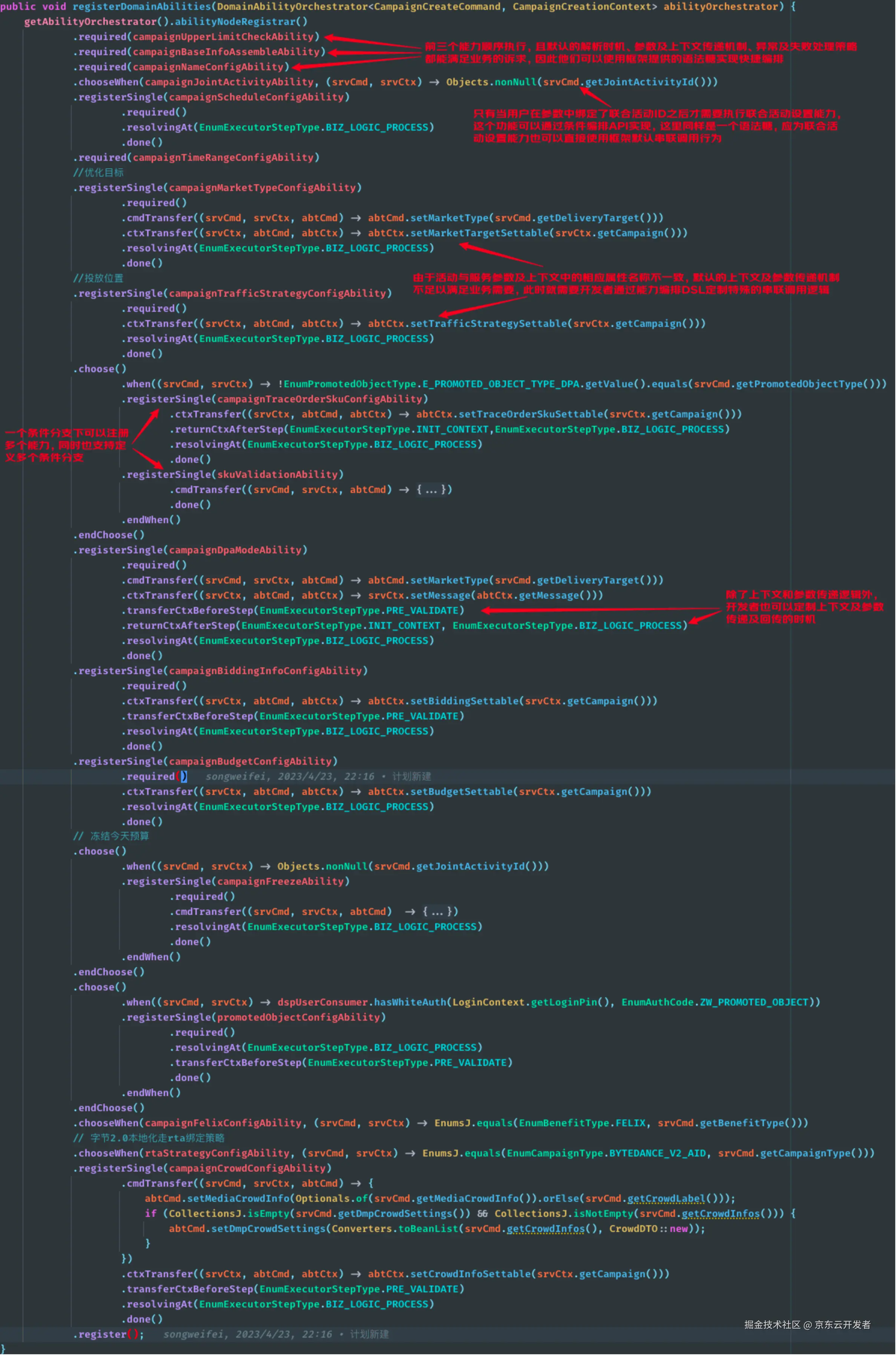 下图给出的是一个站外字节广告计划创建请求处理流程对应的领域能力执行图构建逻辑,可以看出能力编排DSL仅用数十行代码以一种近乎白话文形式描述出了完整的计划构建过程:首先对用户已创建计划数量进行上限检查(CampaignUpperLimitCheckAbility);上限校验通过后会构造出一个空的计划对象并为其填充用户ID、计划类型等基础信息(CampaignBaseInfoAssembleAbility);然后判断本次计划创建请求是否在参数中设置了联合活动ID,如果联合活动ID不为空则需要执行联合活动信息设置相关的业务逻辑(CampaignJointActivityAbility);完成联合活动信息设置之后就要依次设置计划的投放周期(CampaignScheduleConfigAbility)、计划名称(CampaignNameConfigAbility)、营销目标(CampaignMarketTypeConfigAbility)、应用集(TrafficStrategyConfigAbiliy)等模块的相关属性,需要注意的是在上述几个能力的编排逻辑中,由于领域能力的参数或上下文对象中的属性名称与领域服务的参数及上下文中相应属性并不匹配,默认的参数及上下文数据传递机制将无法为这几个属性设值,因此开发者对营销目标设置能力的参数传递(cmdTransfer)、上下文传递(ctxTransfer)、应用集设置能力的上下文传递(ctxTransfer)逻辑进行了自定义拓展,手动实现了参数及上下文中特殊属性的数据映射逻辑;在完成这些业务模块的属性设置之后,如果请求参数中设置的标的物类型为“商品库”,那么接下来就要执行与站外DPA广告业务相关的特殊业务环节:推广SKU的校验(SkuValidateAbility)以及SKU跟单信息的配置(TraceOrderSkuConfigAbility)逻辑......