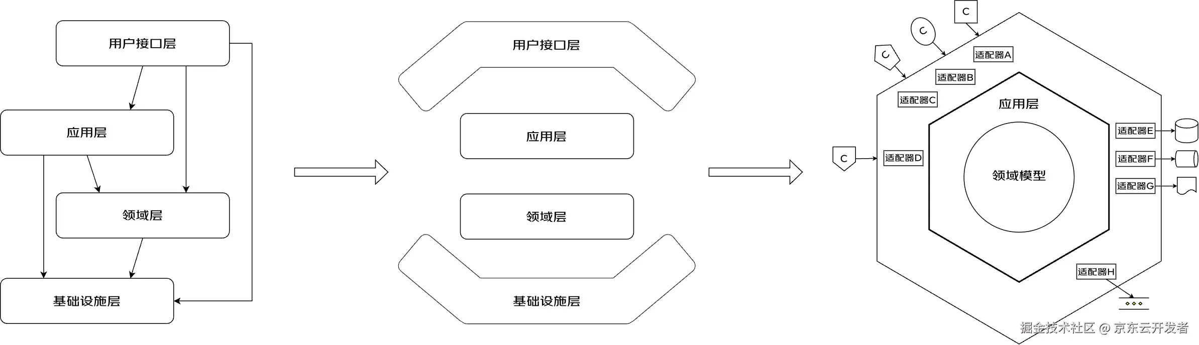 六边形架构实际上是在分层架构的基础上升级而来。领域驱动设计思想作为一种设计的指导思想其实并不会限制使用某种特定的架构,在传统的分层架构上也可以实现领域驱动设计思想的落地。下图中最左侧给出了应用了领域驱动设计思想之后的分层架构,它看上去就是将传统三层架构中的业务层拆分为应用层与领域层。其中领域层负责维护领域模型,所谓的领域模型就是由当前领域内的全部聚合、资源库以及运行在这些聚合实体上领域能力和领域服务构成的;应用层则从业务视角定义了系统应该对外提供多少服务(也就是所谓用例(use case)和用户故事(user story),如果你特别执着于那些术语的话),这些服务接口最终都会调用领域层中的领域服务执行器来实现接口功能;应用层关注的是在系统应该对外提供哪些服务,但是并不关心这些服务的请求来源是RPC调用还是MQ通知,这是用户接口层的职责,它负责根据与调用方达成的约定将应用层接口暴露给不同的接口协议:Http、RPC、MQ、事件通知等等;基础设施层则负责维护系统中使用的众多中间件、工具以及底层存储介质的访问逻辑。