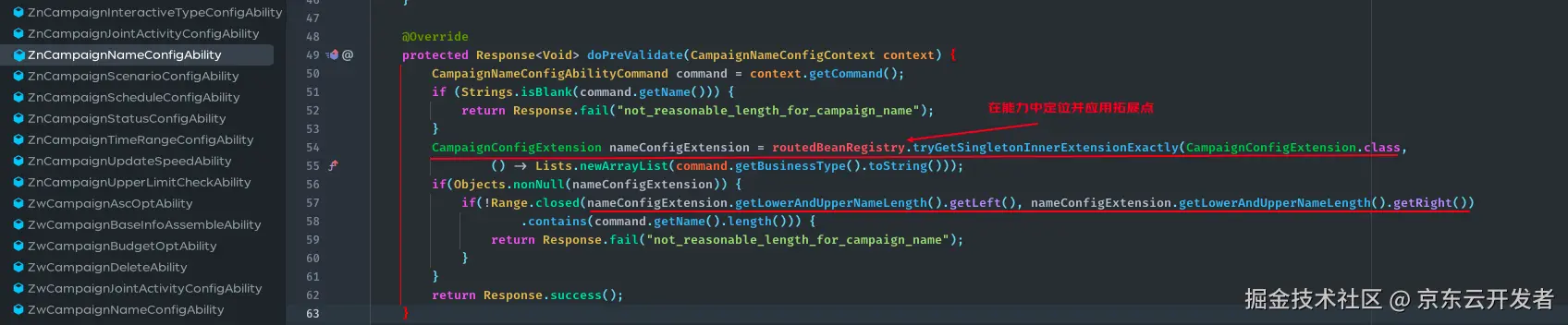上面的例子是在计划名称设置能力中获取不同产品线计划名称长度上下限配置的拓展点,计划名称设置能力自身按照产品线类型进行业务模式路由,但是站内计划名称设置主要业务逻辑基本一致,仅在部分校验逻辑上不同产品线有各自的要求,此时就可以使用一个名称设置能力实例服务所有的站内产品线,定义名称设置主体业务规则,而把不同产品线的细微差异抽象成一个拓展点接口。