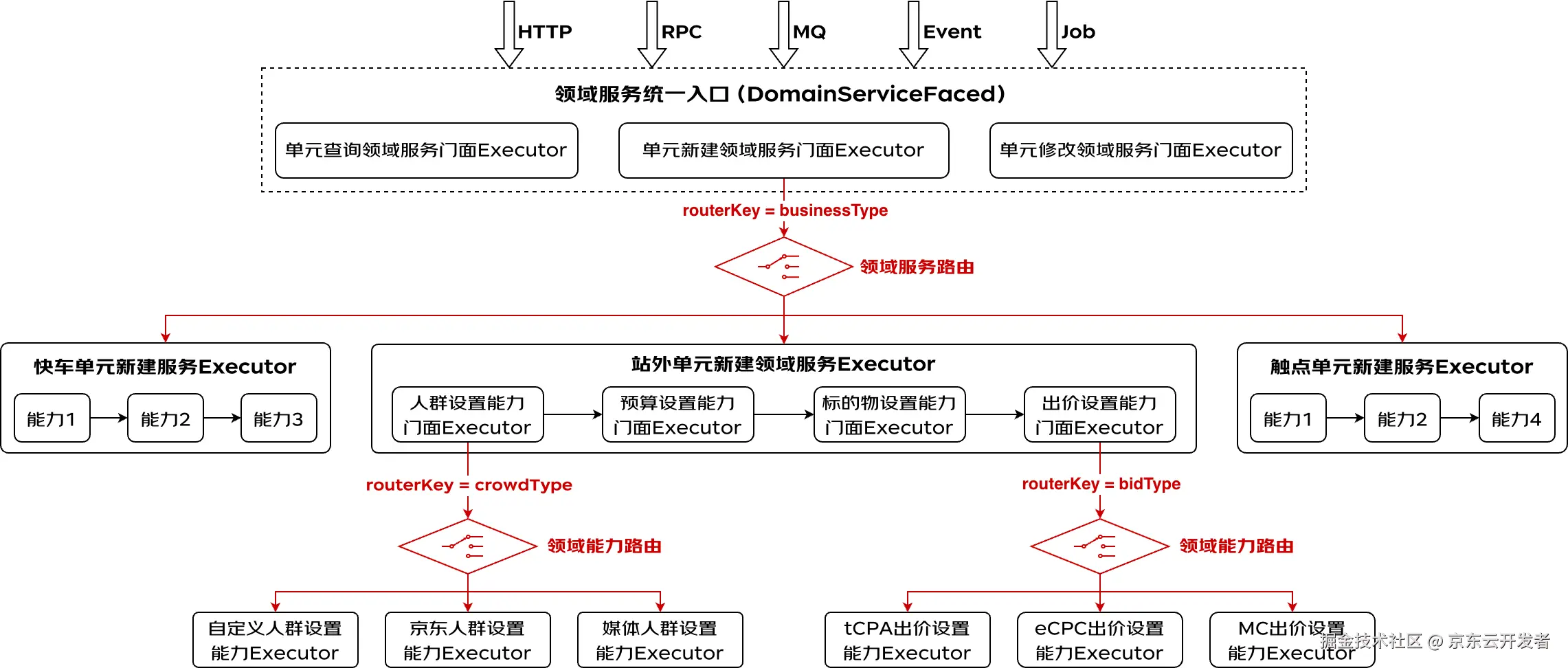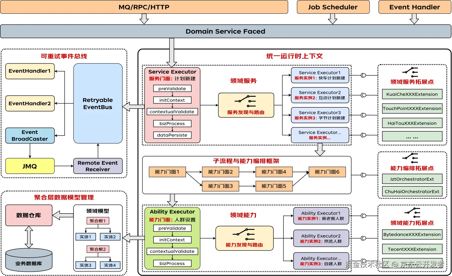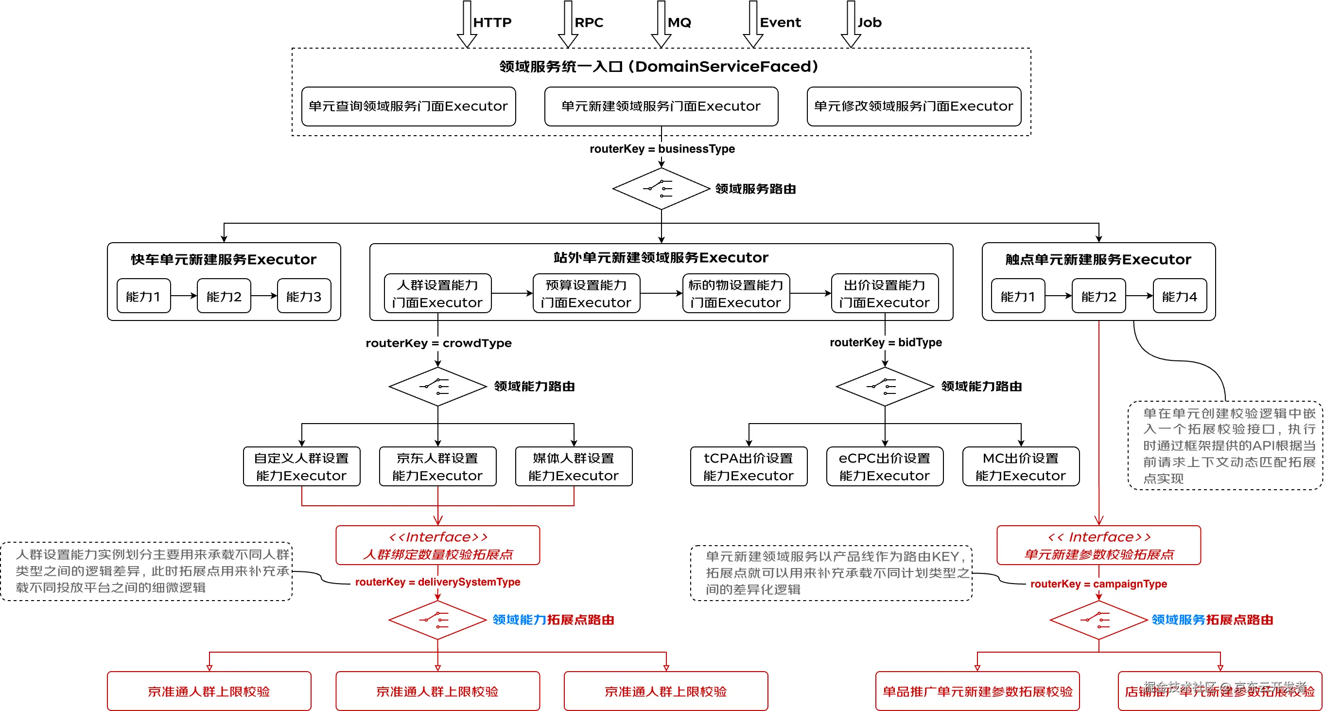 拓展点的作用是作为任意维度的差异点补充分离工具。需要注意的是在新架构中拓展点不是唯一的差异分离工具,在通用对象发现及路由机制下,领域服务、领域能力和拓展点都在不同维度上起着差异点分离的作用。相对与前两者拓展点更加灵活,通常用来承接领域服务及能力自身路由维度之外的逻辑差异。比如出价设置能力已经按照出价方式做了能力维度的差异分离,但是在相同的出价方式下,京准通与流量货币化还存在一些细微的逻辑差异,那么这个时候就可以在该能力实例中通过拓展点来补充实现平台维度的差异逻辑分离。