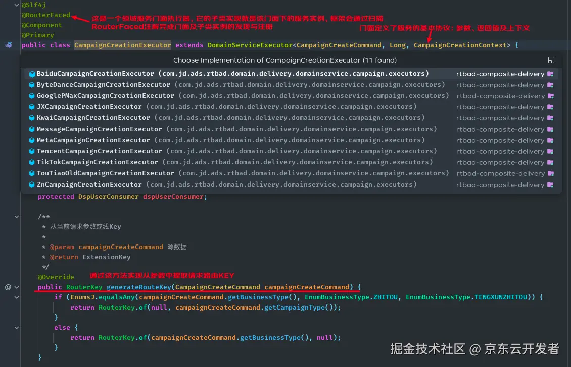 领域服务统一入口引用的是各个领域服务门面执行器,它负责从参数中提取业务标识并定位到具体的领域服务实例。如下图所示,所有具体的领域服务实例都继承自领域服务门面执行器,请求到来时领域服务门面先通过generateRouteKey方法从当前参数中提取出本次请求的业务标识,然后与各个领域服务实例能够支持的业务标识做匹配,从而定位到应该处理本次请求的服务实例。