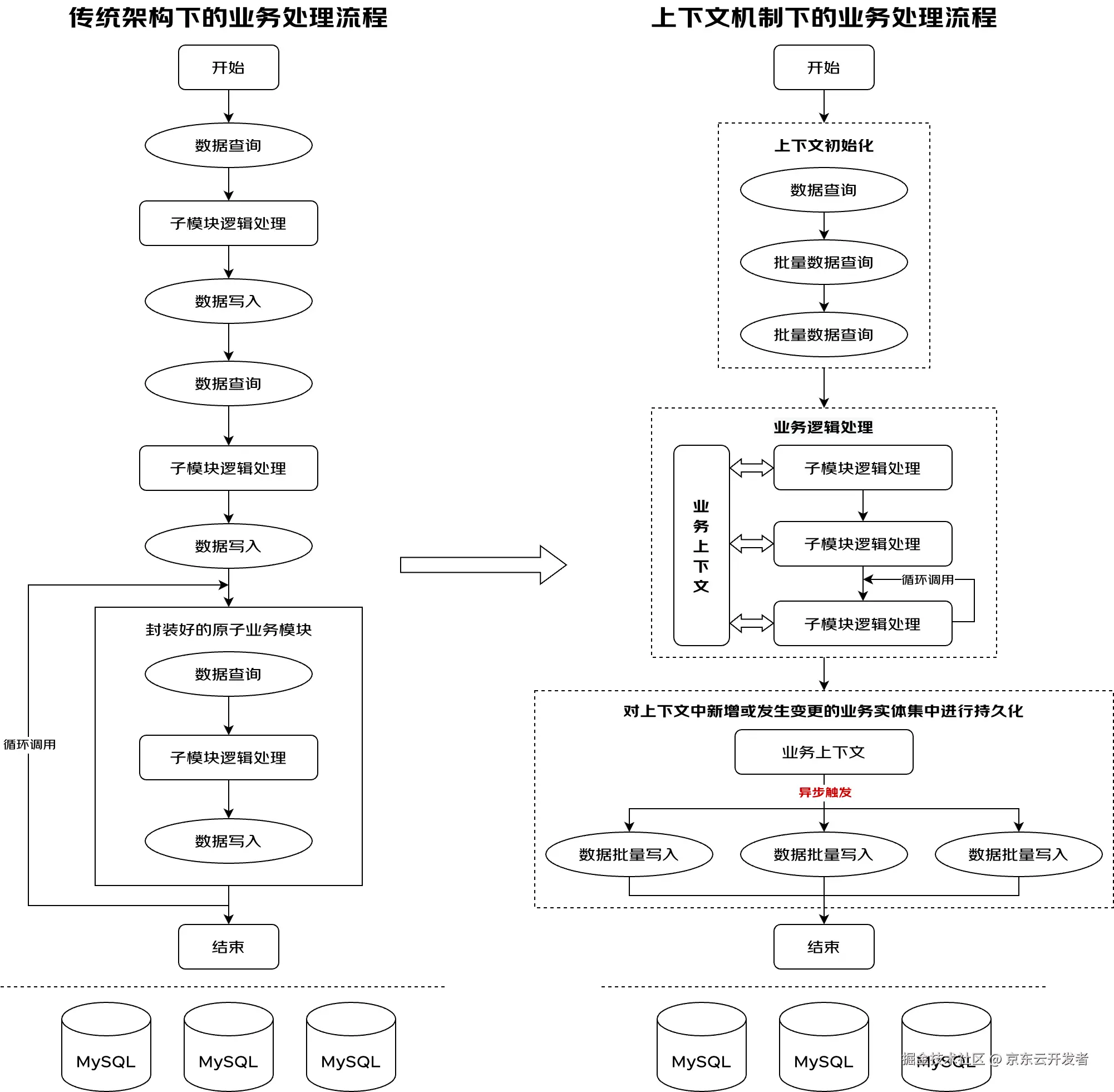 资源库(Repository) 是系统中所有聚合根对象的逻辑集合,当然这并不意味着资源库对象会直接加载和维护系统中所有的聚合根实例,它只是逻辑上的集合。事实上在实现层面业务数据始终保存在数据库等存储介质中,资源库只是定义了针对聚合根或聚合根集合的增删改查操接口,并且维护了底层存储介质中的数据记录与聚合实体对象之间的映射关系以及聚合中各个实体之间的关联组合逻辑。因此开发者可以通过资源库定义的标准接口一键获取到一个组装好的聚合根对象,就好像是从一个集合中取出一个元素那样容易。如下图所示,与传统架构业务层代码在不同业务环节中直接访问数据库的实现方式相比,新架构在上层业务(领域服务)与底层数据库访问层中间插入了一层资源库,上层业务需要获取聚合数据时,不需要自己实现聚合中各个业务实体的查询、映射和组装逻辑,而是通过资源库提供的标准接口直接获取已经组装好的聚合根对象。这种设计将聚合内各个实体的查询、映射及组装逻辑收口屏蔽在资源库内部,让上层业务聚焦在业务规则上,从而实现了数据模型与业务逻辑的分离。这样不仅能够避免在业务逻辑中频繁穿插繁琐的数据查询和组装逻辑,防止在运行时出现重复及碎片化的数据读写操作,资源库集中维护的各个聚合实体的查询、映射和关联逻辑也是一份重要的业务知识,能够辅助开发者快速建立对完整数据模型的全景认知。