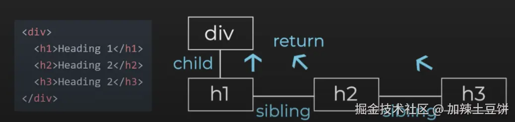 以上图为例,一般我们会认为 div 有三个 children,分别是 h1、h2 与 h3,但 在fiber 架构下只会把第一个children 当作 child,其他 children 则使用 child 的 sibling 来记录,并且透过 return 指回 parent node。