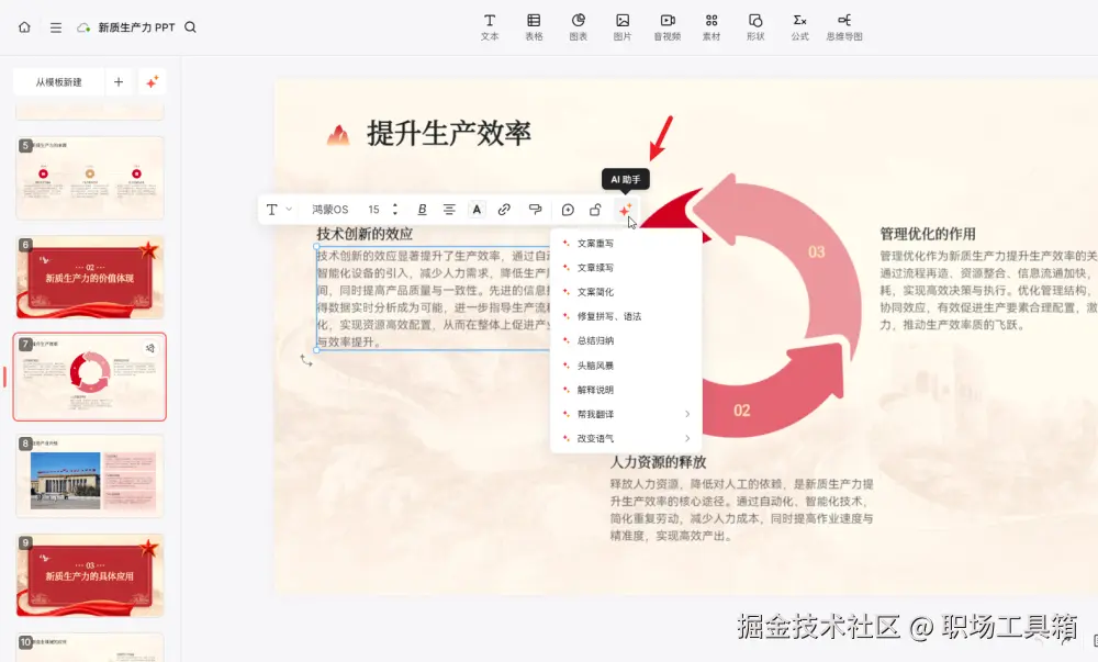 特别值得一提的是,博思AIPPT内置了强大的AI助手。当你在编辑某一页面时,可以随时随地唤醒博思AI助手。比如,你可以要求AI重写某段文字,或者为当前页面生成更专业的描述。AI助手不仅能够优化文案表述,还能根据上下文提供内容建议,帮助你打造逻辑清晰、专业有力的演示内容。