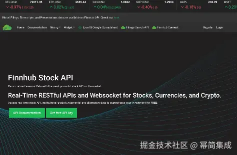 股票-Finnhub 提供实时 RESTful API 和 Websocket 接口,覆盖股票、外汇和加密货币数据。它不仅支持基础的股票行情数据,还提供机构级的基本面和另类数据,适合更深入的投资分析和市场监控。