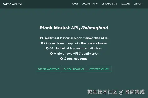 Alpha Vantage 是一个功能强大的 API 平台,提供广泛的市场数据,支持股票、外汇、加密货币等多种数据类型。Alpha Vantage 提供免费和付费服务,免费的 API 已经能够满足大部分开发者的需求。