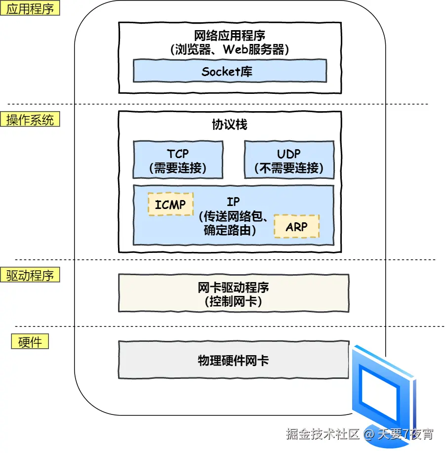 通过 DNS 获取到 IP 后,就可以把 HTTP 的传输工作交给操作系统中的协议栈。